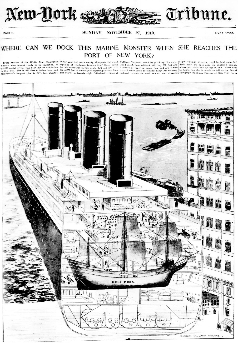 It showed an illustration of Titanic with the famous Halve Maen "Half Moon"—the Dutch ship that sailed into New York Harbor in 1609—wholly contained within Titanic's hull.