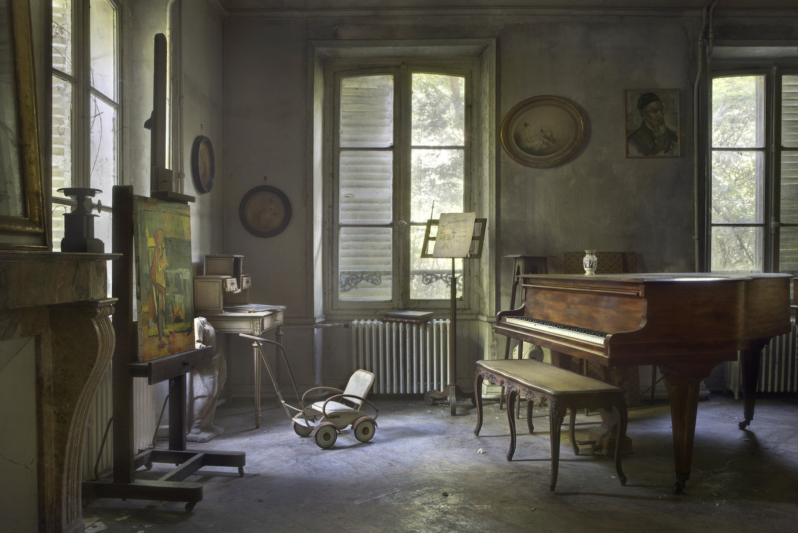 The piano and the music stand tell of a love affair with music. Once the room was filled with the sounds of music and laughter. Family and friends gathered round the piano to sing together.