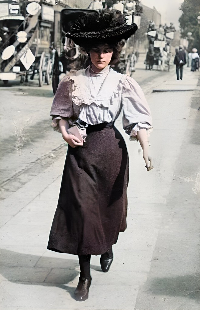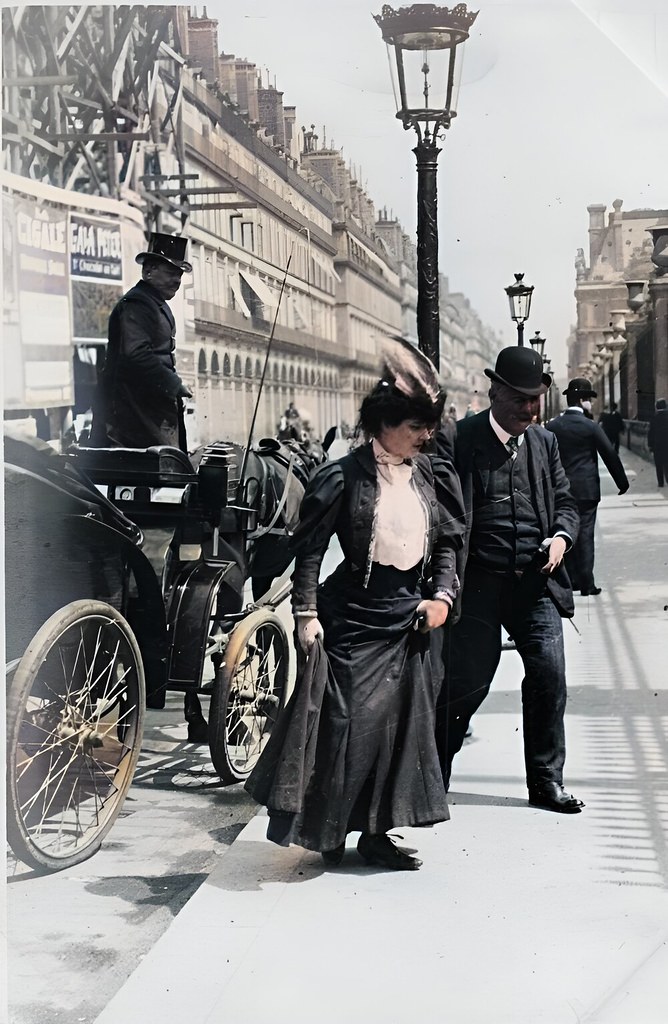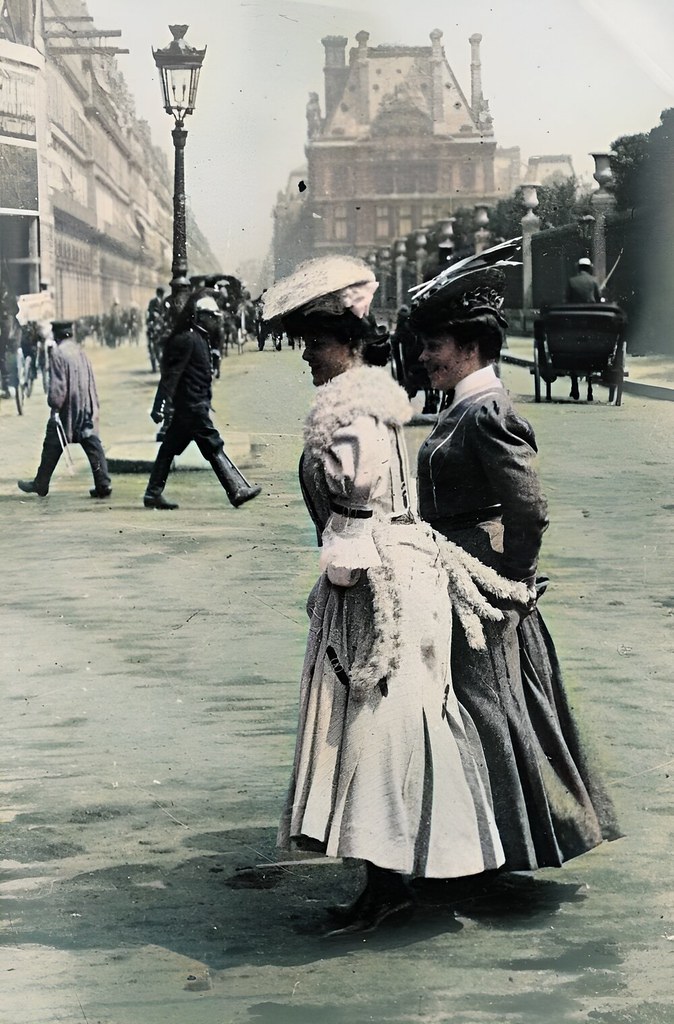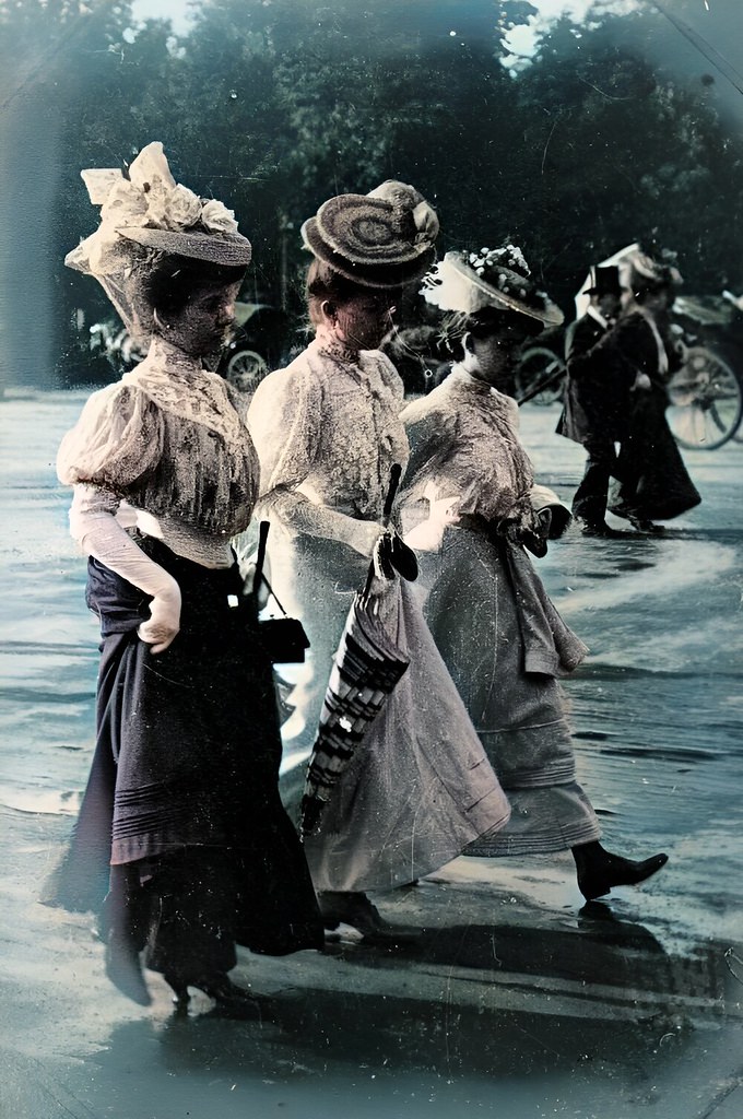 We move to Paris, France. Higher hemlines were a feature of Edwardian skirts that afforded women greater freedom of movement, but at least one of these ladies prefers to lift her skirt to clear the puddles just in case.