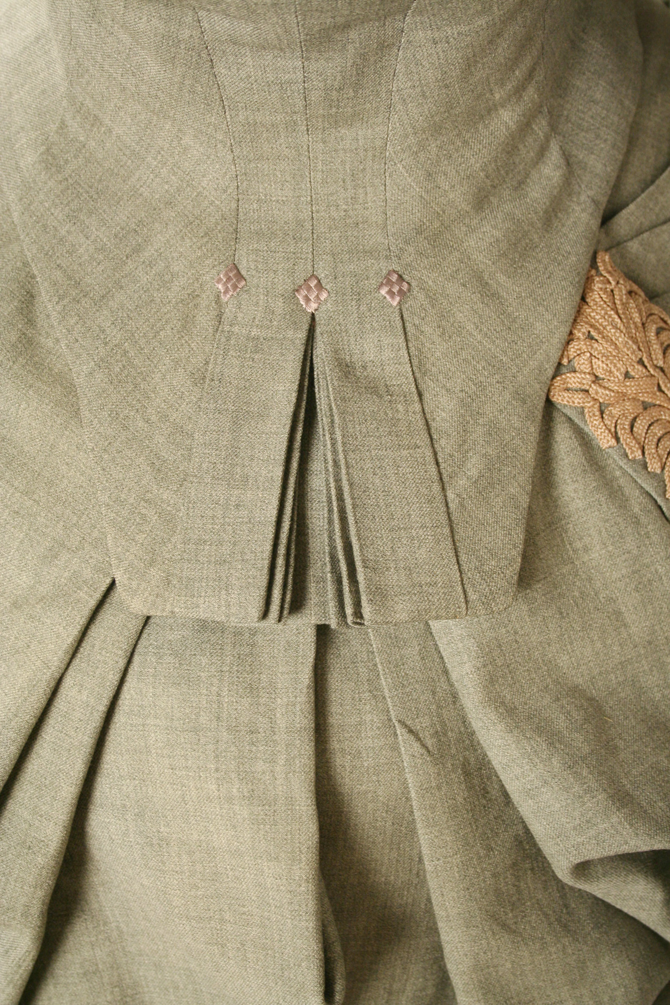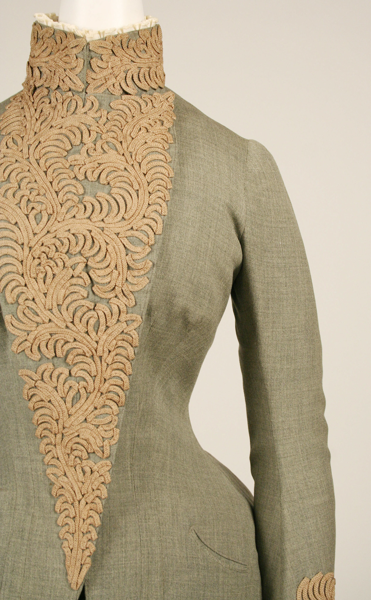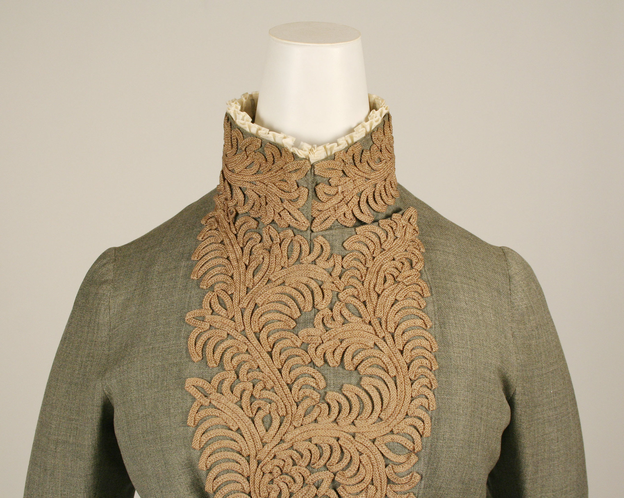 Louise had chosen to wear a gray wool traveling suit. A practical ensemble, the suit consisted of a skirt and two bodices for day wear, an extra set of cuffs, collar, and front insert of gold embroidery on red ground to adapt the suit for more formal occasions.