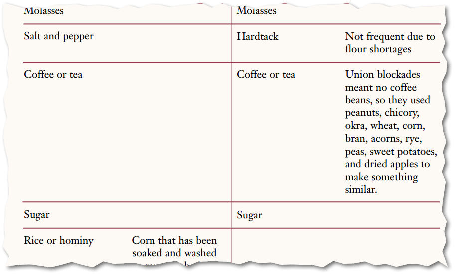 This food list from the Civil War indicated that tea was listed as a staple for both Union (left side) and Confederate soldiers.